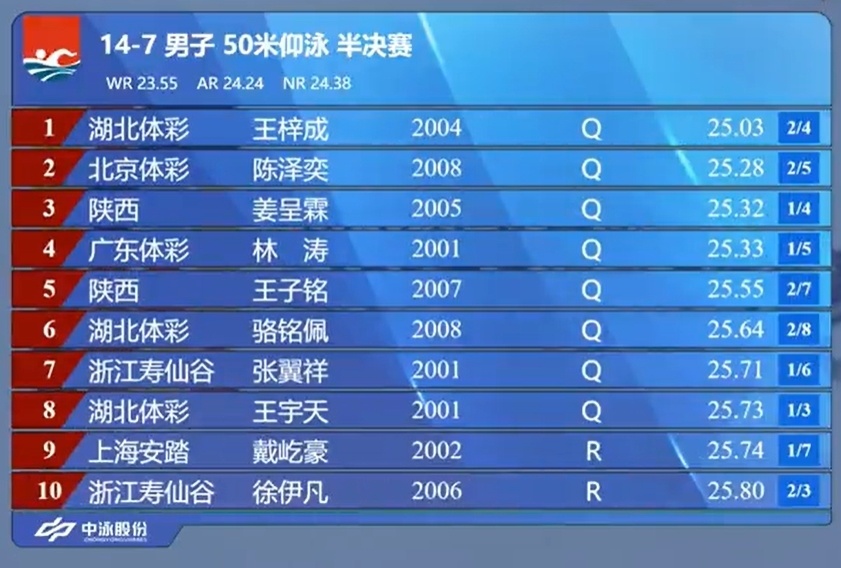 游泳全锦赛第七日半决赛:13岁新秀领跑女50自!王梓成男50仰居首