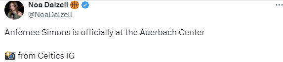 凯尔特人队记者Noa Dalzell在个人推特上写道:“安芬尼-西蒙斯已正式抵达奥尔巴赫中心(凯尔特人队训练馆)。”