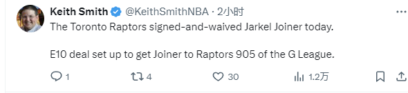 2025-09-12 08:50北京时间9月12日,根据NBA薪金专家Keith Smith报道,猛龙队签约贾克尔-乔伊纳,随后立即将他裁掉,此举是为了让乔伊纳可以加盟猛龙队在G联赛的附属球队。