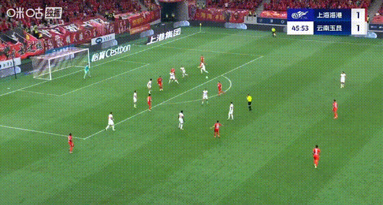 第46分钟,上海海港连续攻门,刘若钒凌空射门将球送进大门,上海海港2-1再度领先。