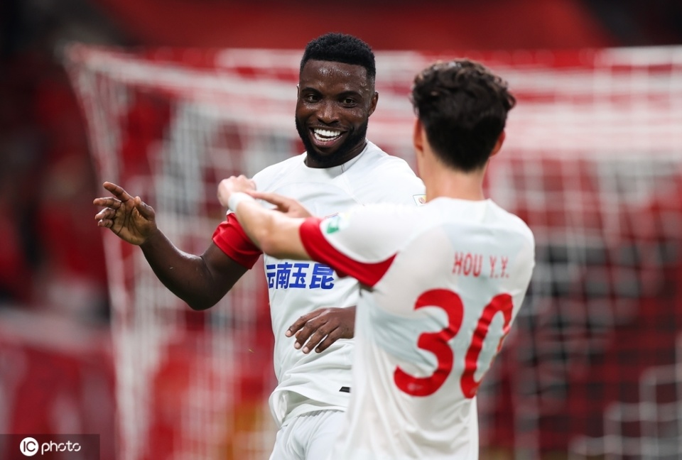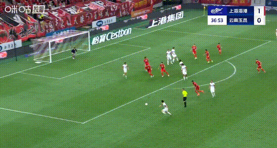 第37分钟,侯永永左侧吊球到禁区中央,奥斯卡跃起头球攻门顶进,云南玉昆扳平比分。