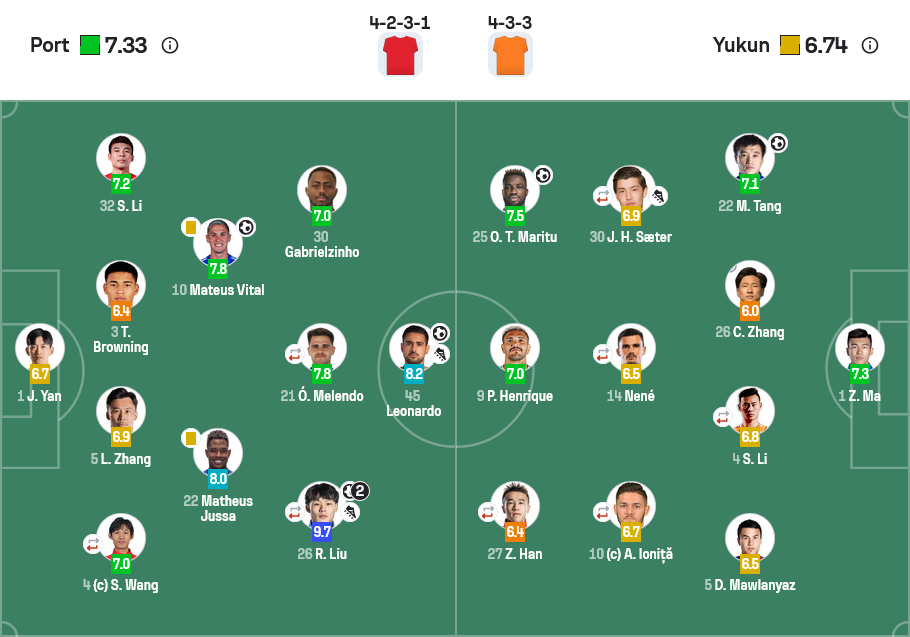 前锋:26-刘若钒【77分,49-李新翔】、30-加布里埃尔、45-莱昂纳多