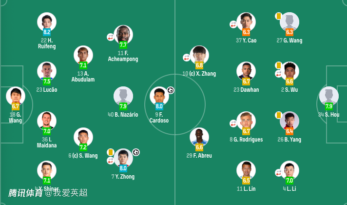 中场:40-纳萨里奥(F)(95'19-杨意林)、6-王上源、13-阿卜杜肉苏力