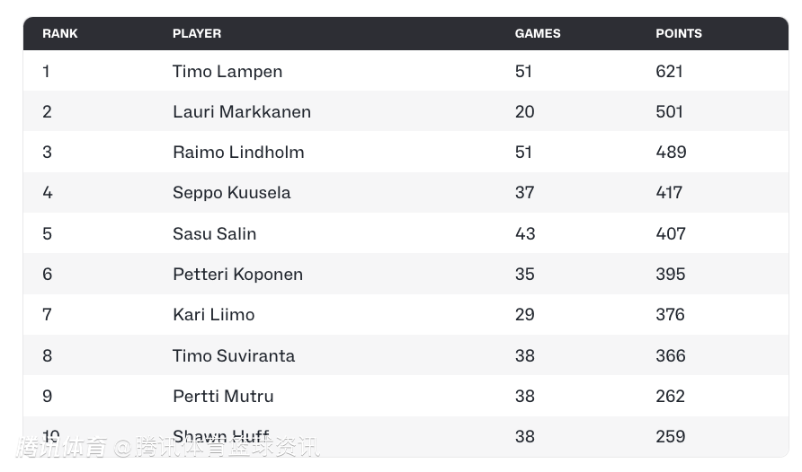 芬兰男篮欧洲杯历史得分榜前十如下: