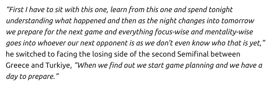卡姆霍亚表示:“首先我需要沉下心来复盘这场比赛,从中吸取教训,今晚要弄清楚问题出在哪里。等明天到来,我们就会开始为下一场(铜牌战)比赛做准备,目前我们还不知道下一个对手是谁,所以之后所有的注意力和心态都会集中在对手身上,一旦确定对手,我们就会立刻制定战术,而且我们有一天的时间来备战。”