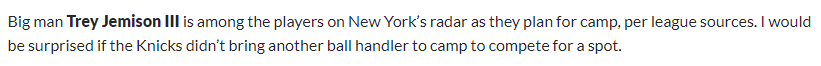 据联盟内部消息人士透露,内线球员特雷-杰米森已进入尼克斯备战训练营的考察名单。此外,Ian Begley分析指出,无论尼克斯在训练营期间签下哪些球员,沙梅特在球队大名单中的位置都十分稳固。这位具备丰富经验的侧翼球员,在上赛季初段成功克服肩伤困扰,并在季后赛中为球队做出贡献,凭借稳定表现和职业态度,在队内拥有较高声望。