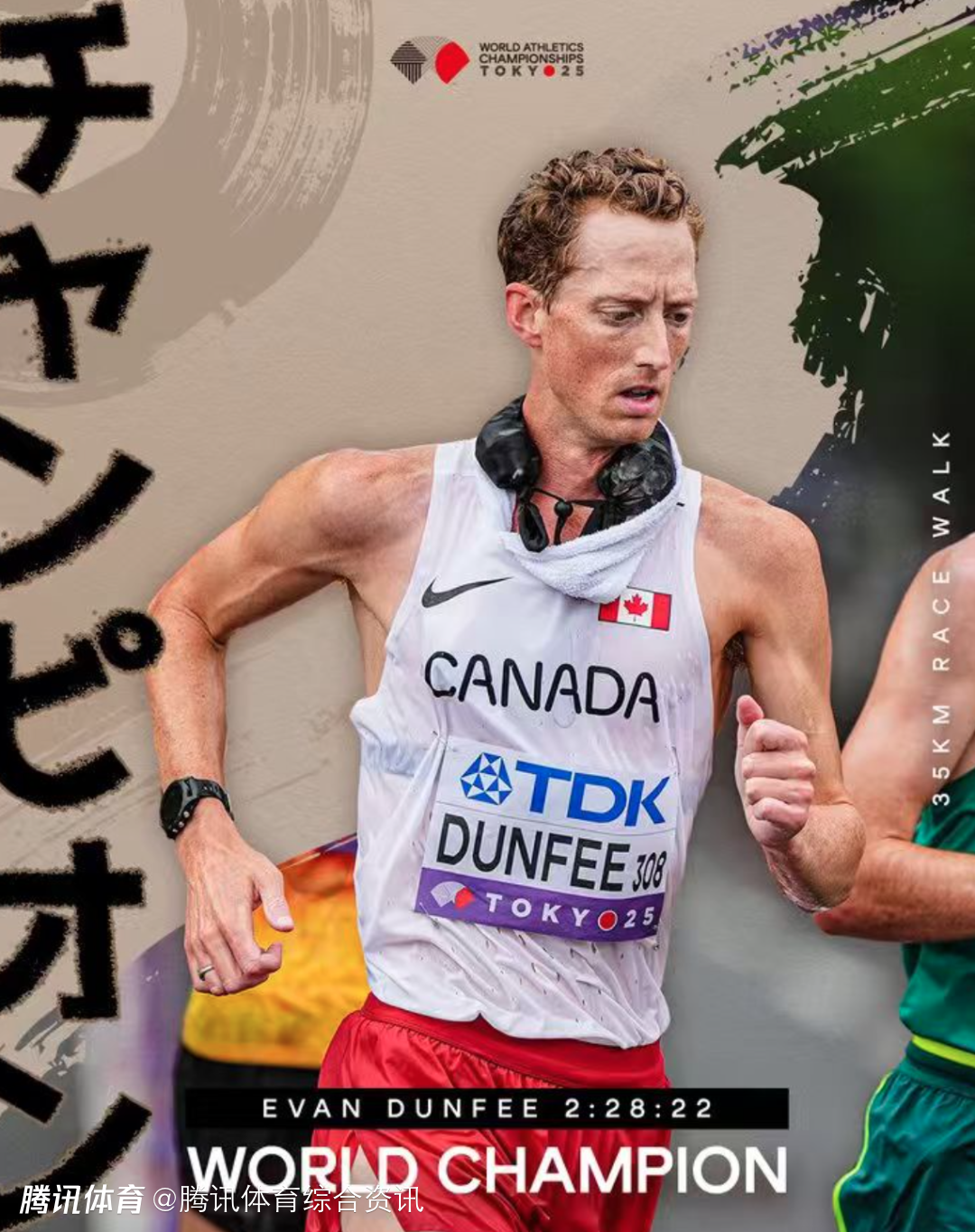 这是邓菲个人生涯的首枚世锦赛金牌,这位加拿大的竞走名将,曾获东京奥运会男子50公里竞走铜牌(后递补为银牌),此次在相同城市,他又得以首夺世锦赛金牌。