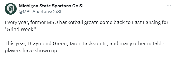 Grind Week是密歇根州立大学一年一度的传统活动,很多毕业生也会选择在此时返校,格林本人则是多次参加这项活动。而今年的Grind Week,除了格林之外,还有包括小贾伦-杰克逊、蒂尔曼等NBA球员返校,他们与大学校队的球员们齐聚一堂,共同进行训练。