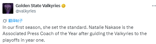 带队首季闯入季后赛!金州女武神主帅娜塔莉荣膺美联社年度最佳教练