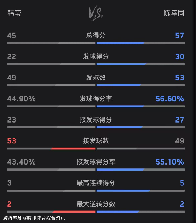 双方技术统计如下(陈幸同在前):总得分57-45、发球得分30-22、发球得分率56.6%-44.9%。