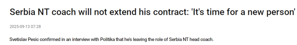 佩西奇的合同将在9月份到期,他表示:“能够成为塞尔维亚男篮的主教练,训练并带领最优秀的塞尔维亚球员是一种荣幸。在领导塞尔维亚男篮时承担责任并做出决策,是一个巨大的挑战。”