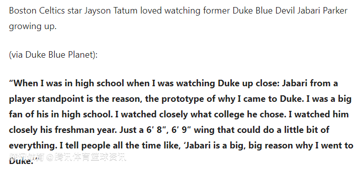 塔图姆:高中时视贾巴里-帕克为偶像 他是我选择杜克大学的重要原因