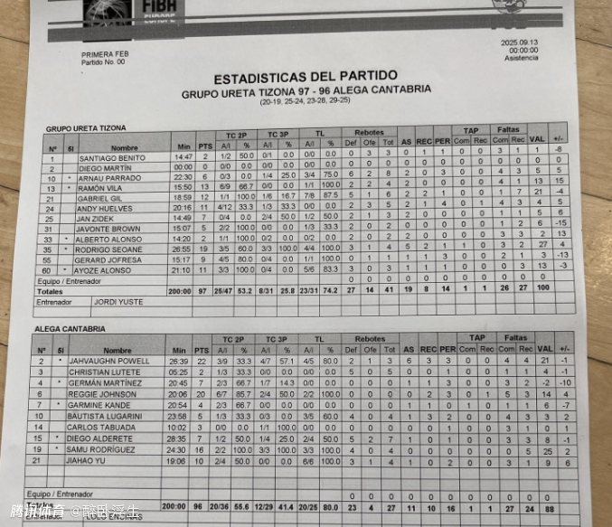 2025-09-14 09:40北京时间9月14日,中国男篮余嘉豪留洋前3场比赛全败,他在季前赛Alega Cantabria96-97惜败Club Baloncesto Tizona的比赛,19分钟贡献10分4篮板1助攻,最后时刻没有超时完成抛射绝杀,却惨遭裁判争议性误判无效,导致连续两场1分惜败与吞下3连败。