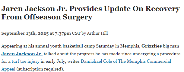 灰熊队预计将在9月底、训练营开启前后对小贾伦-杰克逊的恢复情况进行重新评估。届时距离10月22日灰熊队主场迎战鹈鹕队的新赛季揭幕战,他还有三周多一点的时间备战。小贾伦-杰克逊并未承诺会出战揭幕战,但表示对目前的恢复进展感到满意。