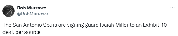 2025-09-14 12:10北京时间9月14日,据NBA记者Rob Murrows报道,有消息人士透露,马刺将和后卫以赛亚-米勒签下一份Exhibit 10合同。