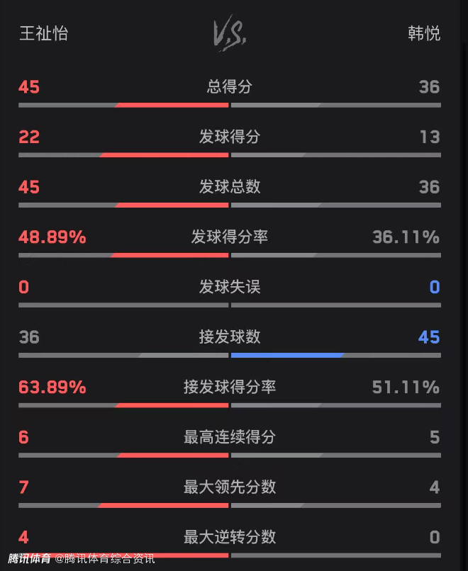 总得分45-36、发球得分22-13、发球得分率48.89%-36.11%。