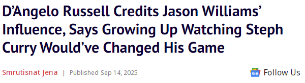 拉塞尔说道:“我以前打球很像白巧克力杰森-威廉姆斯,特别花哨 ,普通传球都要背后运球!常规的击地传球,还得是不看人传球。快攻的时候,还会玩打板传球。要是我小时候就看到库里的打法,我肯定也会模仿库里投进后转身就走。”