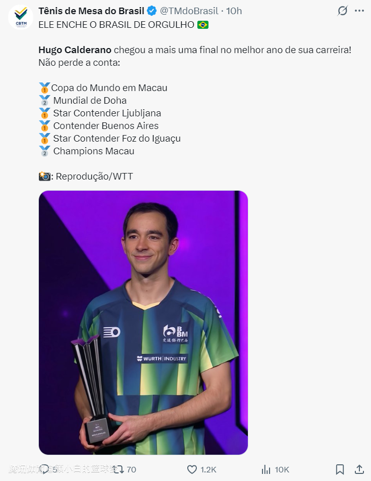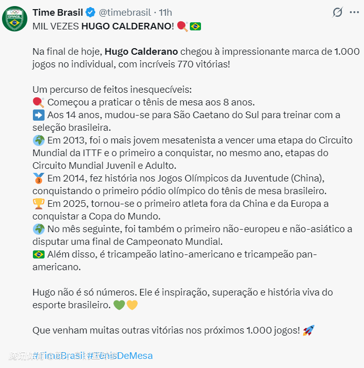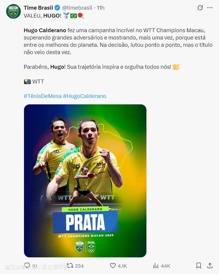 巴西媒体:谢谢你雨果,虽然在澳门冠军赛男单决赛你未能拿下胜利,但你已经证明了自己是世界上最好的乒乓球手之一,你让我们都感到骄傲。