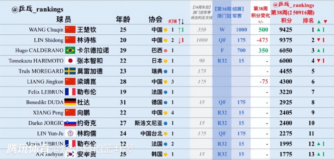 在澳门冠军赛后,世界排名积分又有变化,雨果+350,张本智和没有加分,雨果6050分重返世界第三(这是雨果生涯最高排名),而张本智和6000分跌至世界第四。