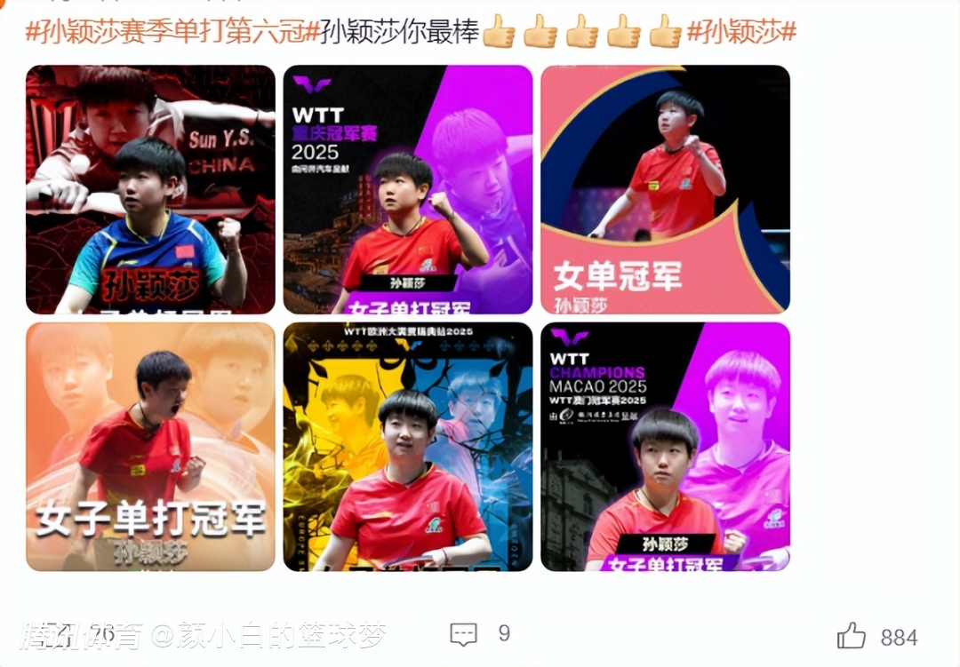 2025赛季孙颖莎已经拿到了6个单打冠军:WTT 新加坡大满贯女单冠军、WTT 重庆冠军赛女单冠军、澳门世界杯女单冠军、多哈世乒赛女单冠军、WTT 瑞典大满贯女单冠军WTT 澳门冠军赛女单冠军。2025年对于孙颖莎来说也是丰收的一年,世乒赛完成双圈金满贯。