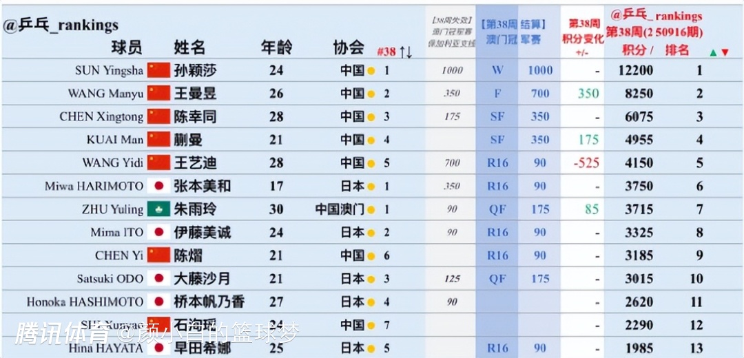 本周结算 wtt澳门冠军赛2025;本周失效:wtt澳门冠军赛2024、wtt帕纳久里什泰支线2024,所以孙颖莎积分还是12200(去年她澳门就是女单冠军所以没有加分),12200依旧是世界乒坛第一高分,孙颖莎稳居世界第一。