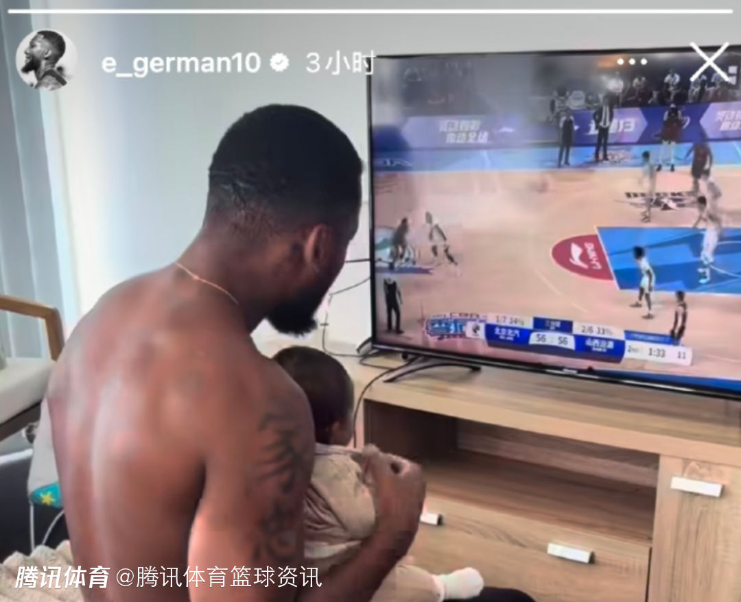 打球要从娃娃抓起!杰曼晒带娃日常 抱着孩子在电视机前看自己CBA集锦
