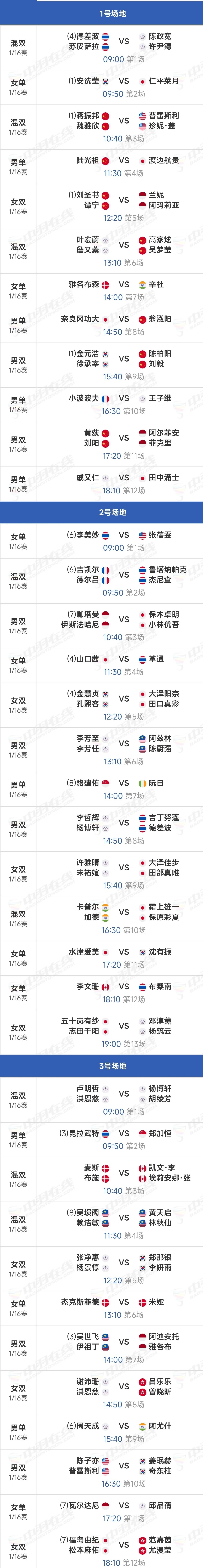 2025-09-15 18:50北京时间9月15日,2025年中国羽毛球大师赛将在9月16日开打,首日赛程已出炉,国羽选手的比赛都在1号场地进行。具体赛程如下(时间为预计时间)——