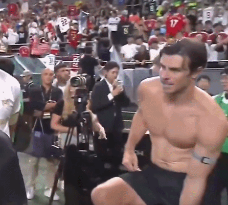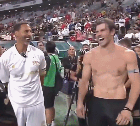 这场表演赛,贝尔所在的矛之队1-2告负。友谊第一,比赛第二,赛后,双方球员有说有笑,交换球衣作为留念。36岁的贝尔脱下球衣,展现出健硕的身材。
