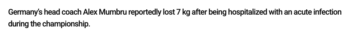 之后,蒙布鲁在德国队首场比赛中重返场边,带队以85-58击败了葡萄牙队。但在四分之一决赛前,他将主教练职责交给了助理教练艾伦-易卜拉希马吉奇,后者此前一直代行其职。蒙布鲁当时解释道:“最近几天我意识到,我的身体状态还不足以在比赛中执教球队,我决定调整教练组内部的职责分工,由艾伦承担起临场主教练的责任。”