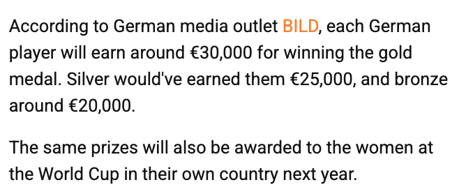 据德国媒体《图片报》报道,德国男篮每位球员将获得约3万欧元奖金。若是夺得银牌,每人可获约2.5万欧元;若获铜牌,奖金则约为2万欧元。同样的奖金标准也将适用于明年在德国本土举办的女篮世界杯——届时若获奖,德国女篮球员也将按此标准领取奖金。