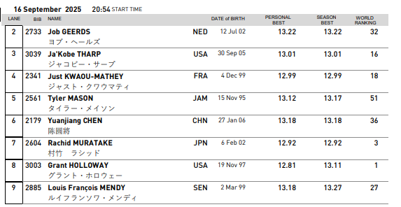 2025-09-16 07:20北京时间9月16日,2025年东京世锦赛将进行男子110米栏的半决赛及决赛。昨晚的预赛,中国队陈圆将、徐卓一、刘俊茜三人晋级,今晚的半决赛三人分别在不同的三个小组,他们将向决赛门票发起冲击。三人的赛季最好成绩在各自小组都比较靠后,都只有放手一搏。其中19岁的陈圆将将与世锦赛三冠王霍洛威、日本混血飞人村竹-拉希德同场PK。