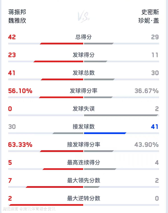 双方技术统计如下(丫邦组合在前):总得分42-29、发球得分23-11、发球得分率56.1%-36.67%。