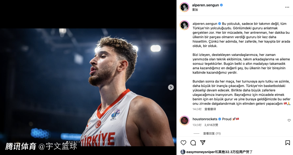 从现在开始,我将以同样的热情、决心和更坚定的信念投入到每场比赛和国际赛事中,土耳其篮球的崛起将继续下去。我相信我们一定会携手取得更大的胜利,为我们的国旗而战是我最大的骄傲,当我们回到这里时,我会尽我所能,在山顶上挥舞它。”
