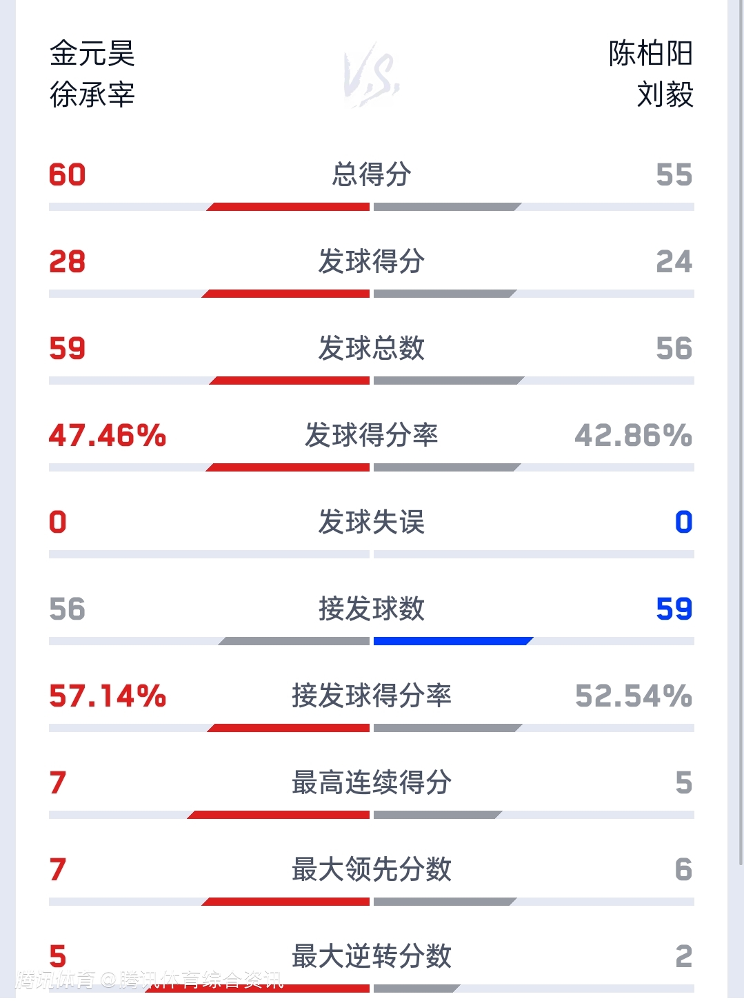 双方技术统计如下(陈柏阳/刘毅在后):总得分60-55、发球得分28-24、发球得分率47.46%-42.86%。