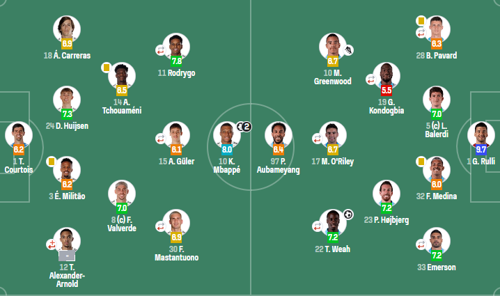 皇家马德里(4-2-3-1):库尔图瓦;阿诺德(4'卡瓦哈尔),米利唐,赫伊森,卡雷拉斯;巴尔韦德,琼阿梅尼;马斯坦托诺(63'布拉欣-迪亚斯),居莱尔(73'劳尔-阿森西奥),罗德里戈(63'维尼修斯);姆巴佩