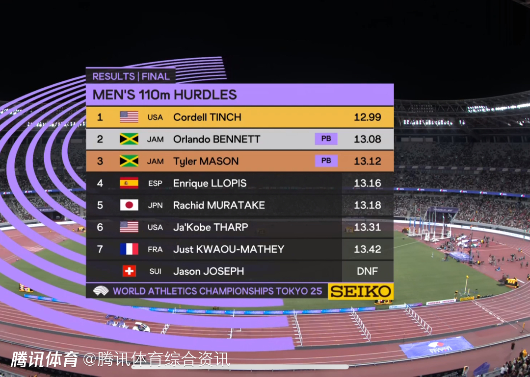 2025-09-17 06:40北京时间9月16日,2025年东京田径世锦赛男子110米栏决赛上演,本赛季世界最好成绩保持者、美国选手廷奇12秒99获得个人110米栏世界大赛首冠,牙买加选手本内特以13秒08刷新PB获得银牌,另一位牙买加选手梅森以13秒12追平PB获得铜牌。