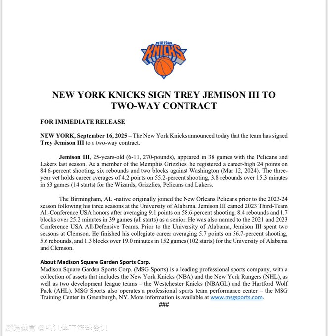 2025-09-17 07:10北京时间9月17日,尼克斯官方发布公告,球队已用Exhibit 9合同签下中锋亚历克斯-莱恩,用Exhibit 10合同签下前锋马特-瑞安,并和特雷-杰米森签下一份双向合同。无独有偶,这三人均曾效力于湖人。