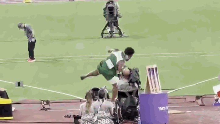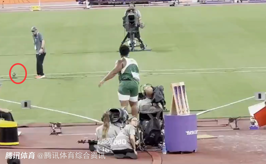 当时,尼日利亚选手埃内克维奇在准备进行比赛时,有一位看铅球落点的辅助裁判,显然没有注意到比赛提示,他依然低着头在场地内踩草坪,多少平整一下选手投掷铅球造成的场地损坏。