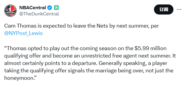 2025-09-17 08:00北京时间9月17日,篮网队记Brian Lewis谈及卡姆-托马斯的未来,这位球员今夏与球队签下一年599万美元的资质报价。