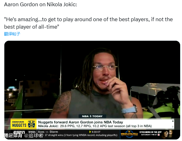 在节目中谈到约基奇,戈登表示:“他太棒了,他是历史最佳球员之一,他就是有那种‘引力’,还有他单脚投篮的那种球,所有人都相信他能进;和他打球我只需要站在自己的位置上,做好自己的事情,一切就顺理成章了,我们在场上场下都有着很好的默契。”