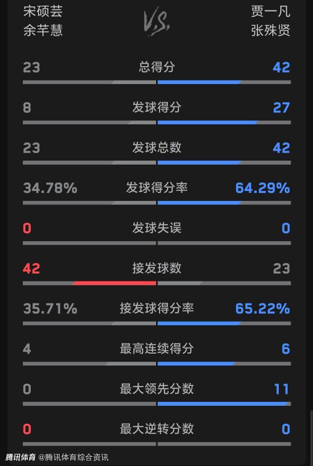 双方技术统计如下(贾一凡/张殊贤在后):总得分23-42、发球得分8-27、发球得分率34.78%-64.29%。
