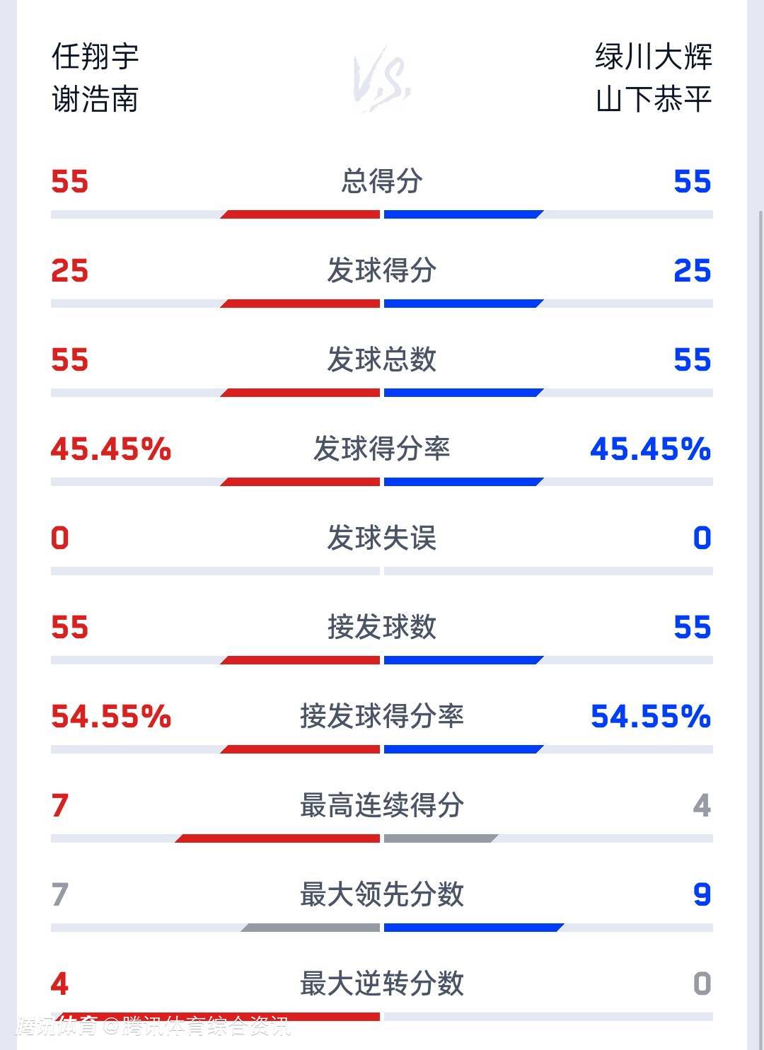 双方技术统计如下(任翔宇/谢浩南在前):总得分55-55、发球得分25-25、发球得分率45.45%-45.45%。