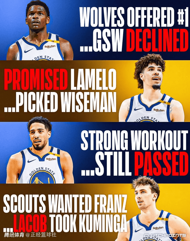 据报道称,早在2020年,森林狼队曾试图将状元签交易给勇士队。但勇士队拒绝了,之后森林狼队选中安东尼-爱德华兹,而勇士则在第2顺位选中詹姆斯-怀斯曼。如今爱德华兹已经成为巨星,而怀斯曼则几乎就要淡出这个联盟。