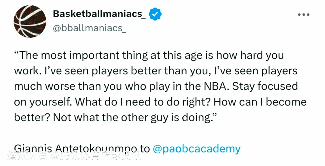 字母哥说道:“在你们这个年纪,努力的分量远比天赋更重。我见过不少比你们起点高的球员,也见过很多起初表现平平,最终却站上NBA赛场的人。别总盯着别人的脚步,多问问自己:我需要做好哪些事?怎样才能让今天的自己比昨天更强?把注意力放在打磨自身上,这才是最该做的事。”
