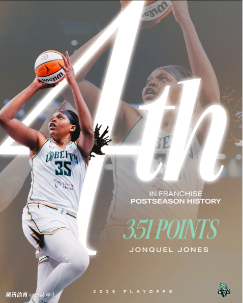 纽约自由人首发中锋琼斯效力球队季后赛得分达到351分,升至队史季后赛得分榜第四位。