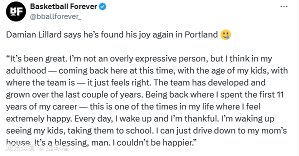 谈到回归波特兰的感受,利拉德表示:“感觉太棒了,我不是一个爱表达的人,但我觉得在如今这个年纪,随着我的孩子们的成长,随着球队的发展,这感觉一切都刚刚好。过去几年开拓者不断发展和成长,我回到了曾度过了11年职业生涯的地方,这段时间可以说是生命中最让我幸福的时光。我每天醒来都很感恩,醒来看到我的孩子们,开车送他们去学校,然后直接就能开车去我妈妈家里,这简直就是幸福,我不能再开心了。”