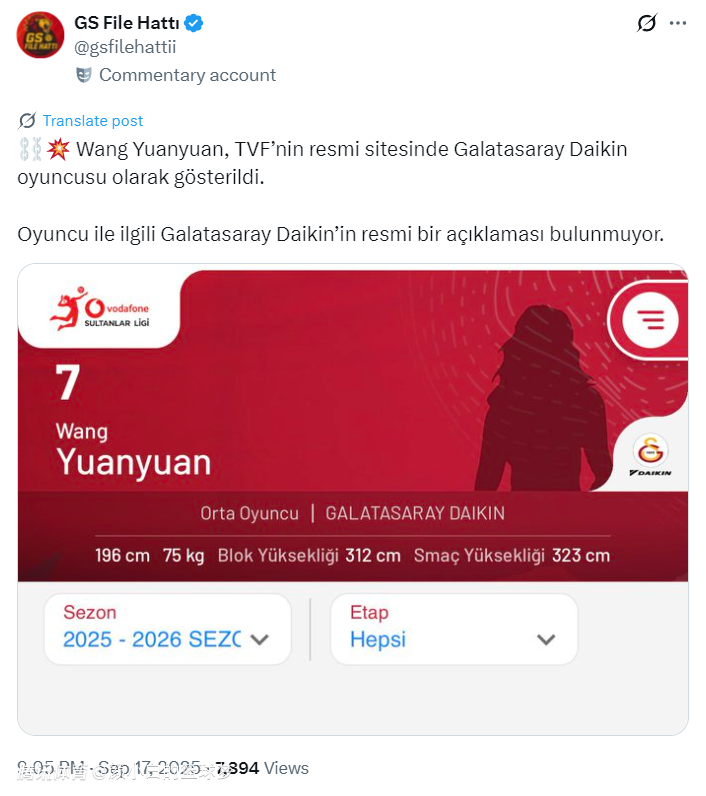 2025-09-18 12:00北京时间9月17日,根据土耳其媒体GS File Hatt的报道,中国球员王媛媛的名字出现在土超技术统计网站加拉塔萨雷大名单中,但目前加拉塔萨雷还没有官宣王媛媛加盟。