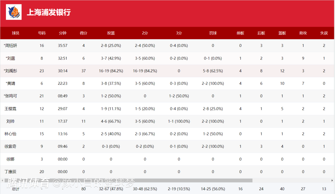这场比赛上海队这边只有2人得分上双,刘帅拿到11分,刘禹彤30分钟,19中16,罚球8中5,拿到37分12篮板3助攻1盖帽,命中率84.2%,刘禹彤这表现像是打U16亚洲杯的张子宇啊。