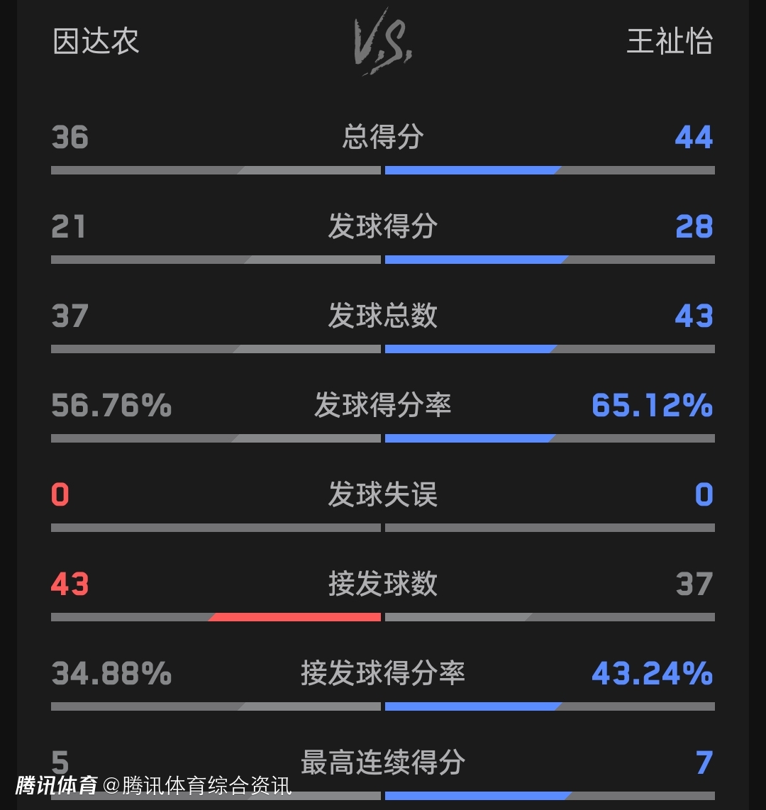 双方技术统计如下(王祉怡在后):总得分36-44、发球得分21-28、发球得分率56.76%-65.12%。