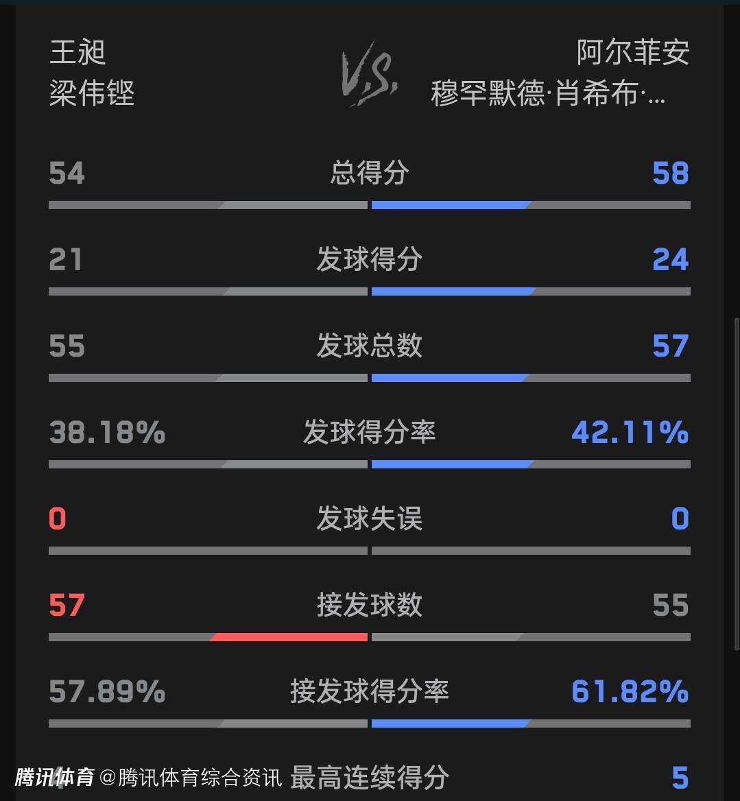 双方技术统计如下(梁伟铿/王昶在前):总得分54-58、发球得分21-24、发球得分率38.18%-42.11%。